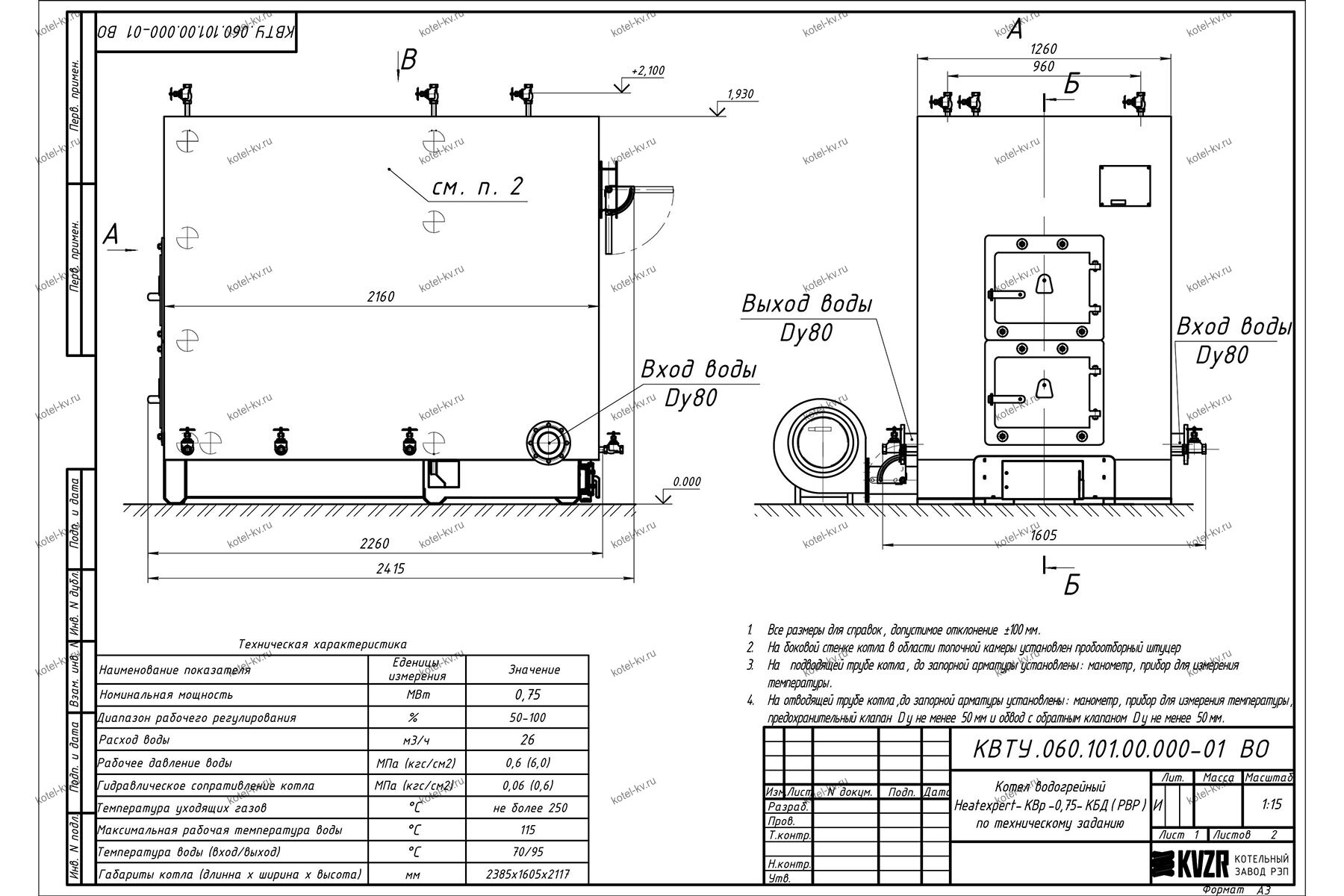 Водогрейный котел КВр 0 75 МВт всегда есть в наличии на складе завода производителя, действующая цена указана на сайте, стоимость установок по техническому заданию заказчика рассчитывается под заказ. Возможные варианты изменения устройства модели - корректировка габаритных размеров, изменение места подвода и выхода теплоносителя, изменение размеров и расположения загрузочного окна и подобное. Производство отопительных котлов мощностью 0.75 МВт по техническому заданию завод осуществляет в течении 10-20 рабочих дней.